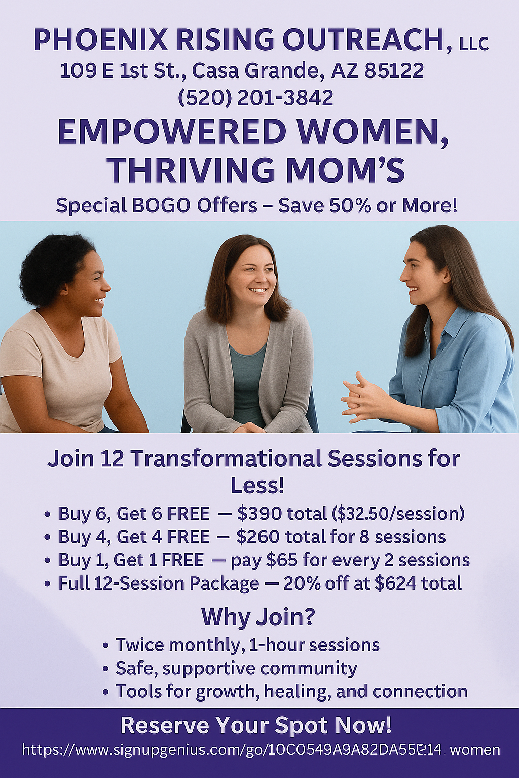 Upcoming Event: Date TBD, from 10:00 a.m. to 11:00 a.m., we will be hosting the Empowered Women, Thriving Moms Support Group. Each session is 1 hour, 2 Saturdays per month. There will be 12 sessions in total, which will take 6 months to complete. We will cover a variety of topics and include different activities. We encourage all women and moms to attend to learn new skills to empower themselves and thrive every day of their lives! Please sign up by calling/texting our business number (520) 201-3842 or send an email to info@phxrisingoutreachgmail.com. The cost is $65 per class, or see our BOGO pricing listed below.